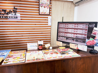 レジはタブレット端末で行い、商品メニューはカウンターに設置された画面に表示されています。